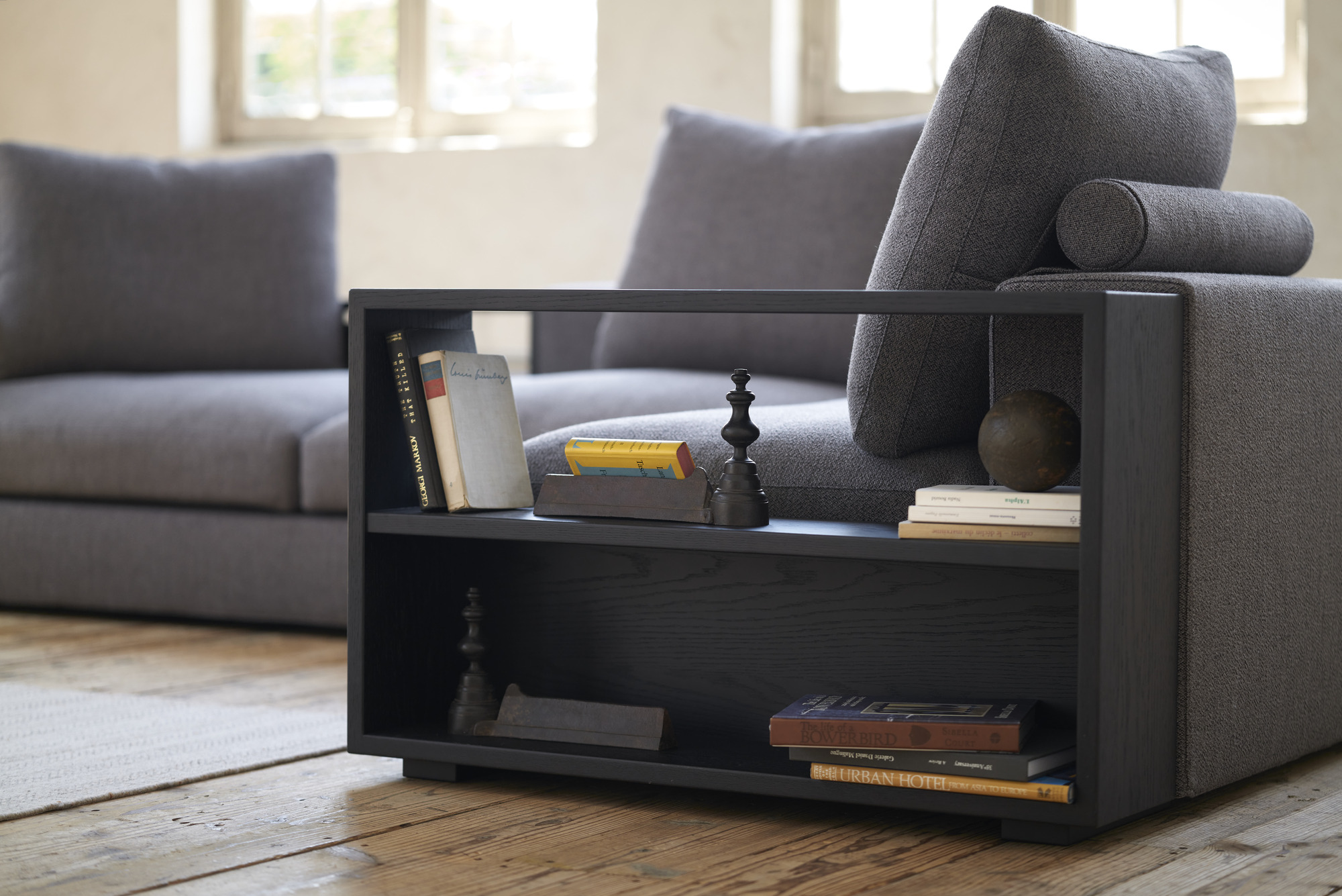 ソファ背面の木棚には、読み終えた本やこれから出会う一冊、タブレットなどの小物もそっと置ける。ウッドアームを選べば、側面も棚として使うことができる。お気に入りを手に届く距離に並べれば、そこに自分だけの小さな特別な居場所が生まれる。