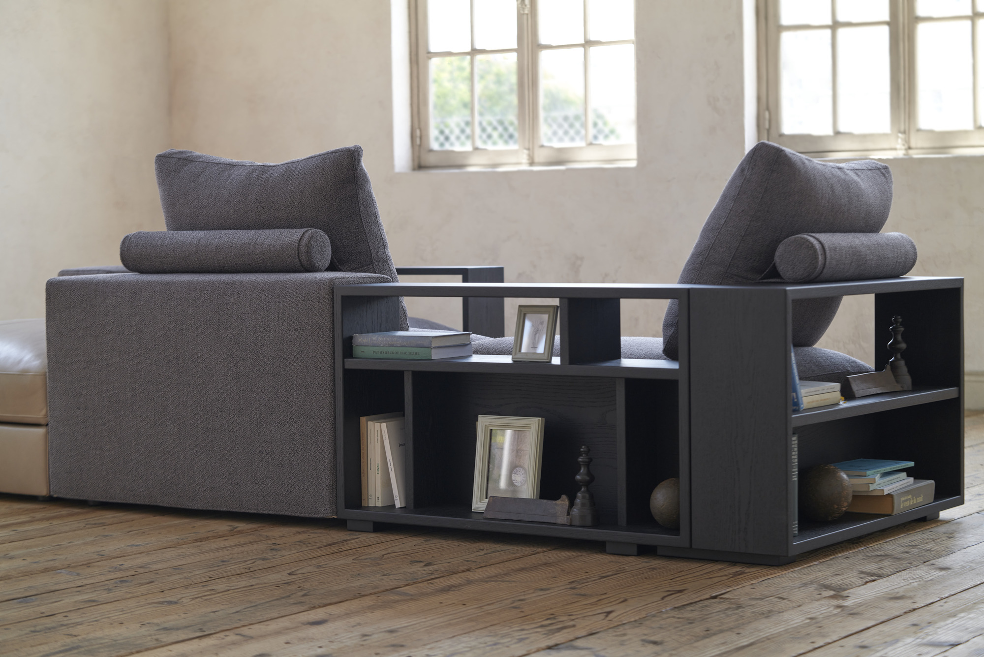 柔らかな包容力と静かな佇まい。ダウンフェザーのクッションに身をあずければ、時間は緩やかににほどけていく。お気に入りの本を開くひととき。傍らの木棚には、次の出会いを待つ一冊がそっと控えている。気づけば夜が明けるまで過ごしてしまう。そんな特別な居場所。