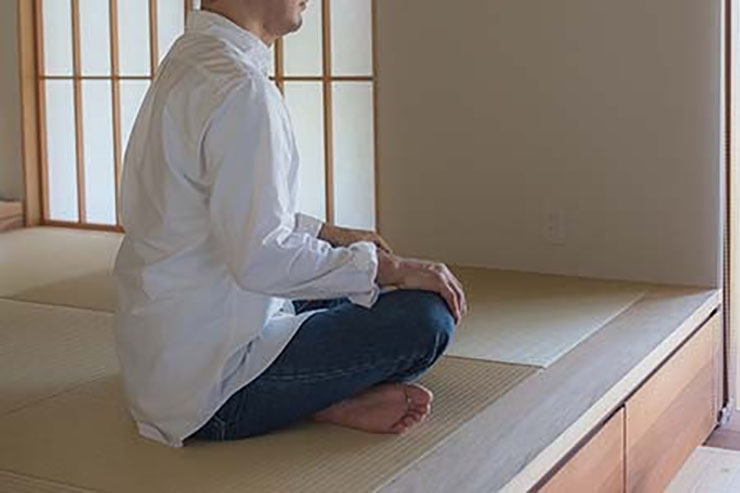 日本の畳文化に通じる硬めの座り心地は、身体に自然と馴染む感覚。胡坐をかき、背筋をすっと伸びる姿勢を思い描きながら、座面にわずかな傾斜をつけ、しっかりとした硬さの背が軸を支え、柔らかな腰クッションが身体の輪郭にそっと寄り添う。