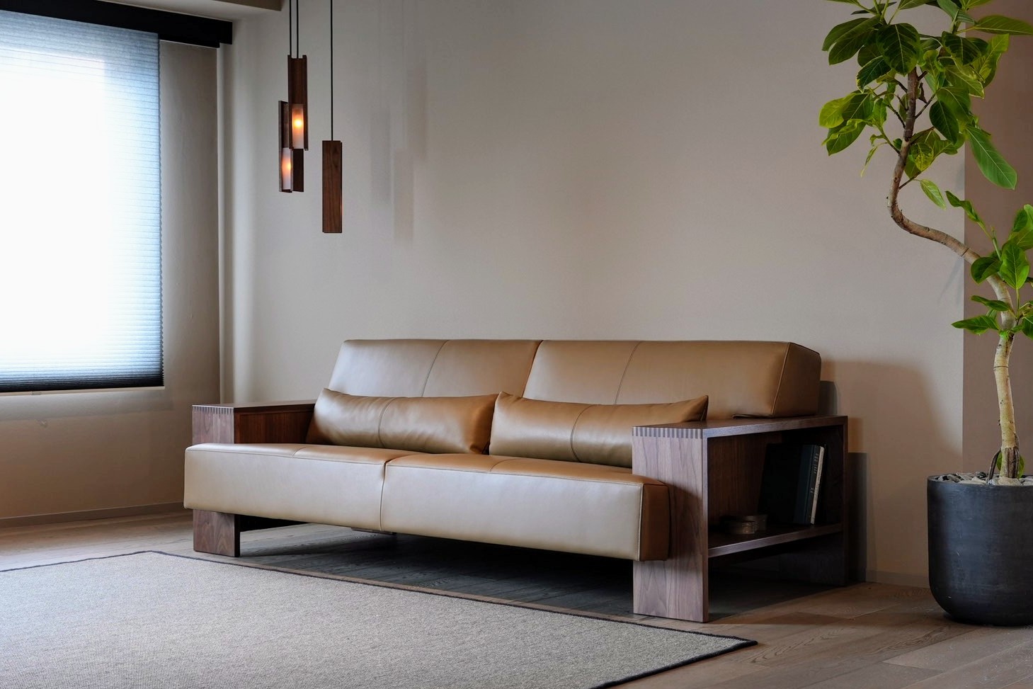 どっしりとしたフォルムに、脚下の余白が軽やかさを添える。ロボット掃除機にも対応し、日常の使いやすさにも配慮。水平ラインを丁寧に整えた佇まいが、日本の住空間に溶け込み、凛とした存在感を生み出す。